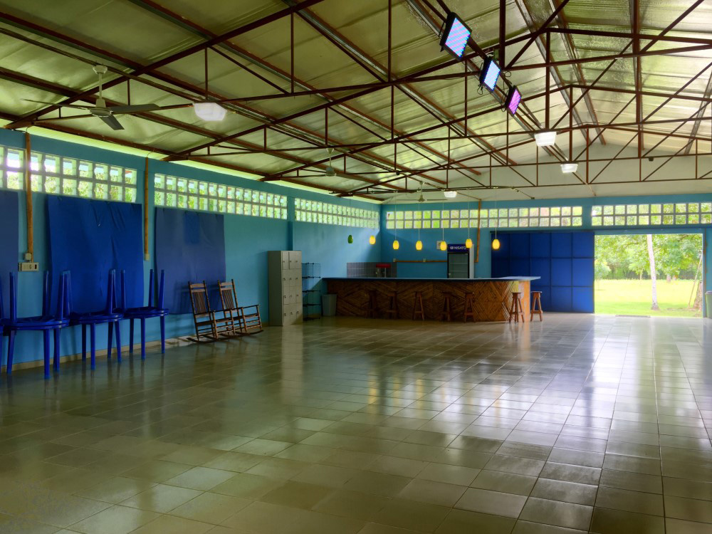 - A 365 m2 events center with a large parking lot. The building has washrooms, a stage, a kitchen with a long bar, and a wide open floor.
